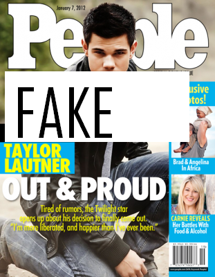 Taylor Lautner is not coming out in the January 7th issue of People Magazine. Apparently a manip (manipulated photo) that had its origins on Tumblr somehow got picked up by a variety of news services as legit. It is in fact A FAKE. The photo itself is real enough having been part of the New Moon PR campaign, but the text is entirely bogus. Gossip Cop has full details.