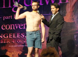 When the major Q & A’s are over I make a beeline for the bathroom (ladies you understand) and come back about 30 minutes later to witness the end of the costume contest. All of a sudden I see this…well…from one pale Irish gal to one similarly afflicted…one pasty white dude with no shirt on and jeans shorts. You tend not to see things like that too often at conventions. All of a sudden I go to the person next to me, “I swear that’s Ryan.” She confirms, “That’s him all right.” So I whip out my video camera. Alas Ryan didn’t win, but he was a clear crowd favorite for just sheer guts.