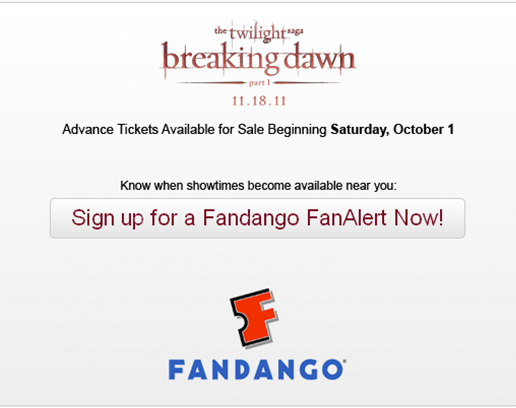 Reader probably remember how Fandango partnered with Summit to reveal a personalized wedding invitation to Bella and Edward’s wedding coupled with a ticket sale alert. Definitely that marketing venture paid off!  What do you think they will come up with for part 2?