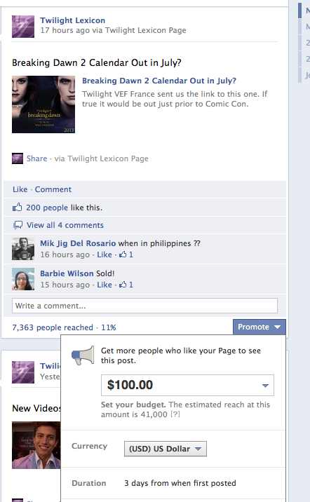 The Twilight Lexicon has roughly 65,000 Facebook fans. For us to reach all of the people who have chosen to like us on Facebook, the denizens at Facebook wants us to PAY for that privilege. EVERY TIME WE POST to the tune of approximately $200. As we post roughly 4-6 stories a day in slow months and 10-15 in busy months, you could see how economically this will be impossible. The costs inside of a week to ensure that everyone saw everything would be more than my mortgage payment FIVE TIMES OVER. On a slow month it would equal my son’s college tuition. So for free, we can reach roughly the 10% of you that comment. In any fandom or online enterprise only 10% leave a comment, this is not a statistic that only applies to Twilight.