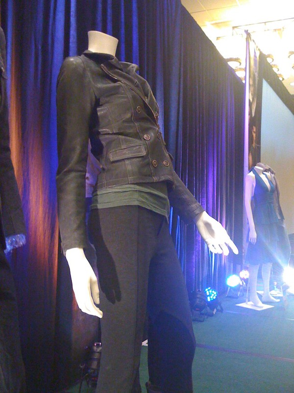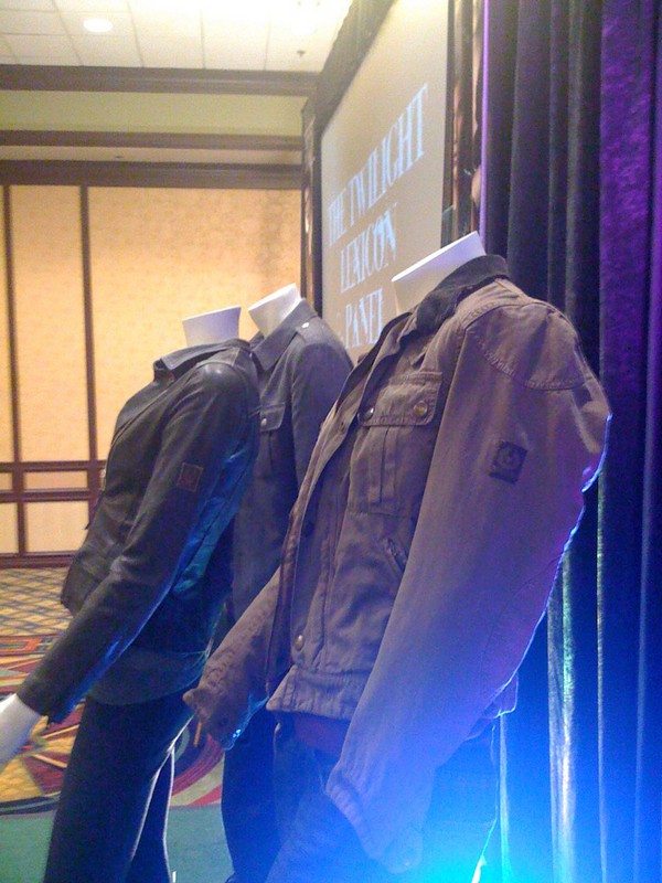 A little over a year ago Laura attended a one of the Official Twilight Conventions run by Creation Entertainment (I think it was San Fransisco but I’m not 100% sure.) They had just put up on display a bunch of costumes that had arrived fresh from the set of Breaking Dawn. At the time, we didn’t know if they were from part 1 or part 2. All we knew was that they were definitely used on set because the clothes (especially the shoes) had dirt all over them. So in other words they weren’t just photo-shoot or standby costumes in case something ripped, they had actually seen use and wear and tear. Well based on what Kristen Stewart and Robert Pattinson are wearing in the EW photo that is teasing tomorrow’s cover shot, they are the same clothes! Here they are up close, and you can clearly see the dirt on Rob’s shoes in the photos: