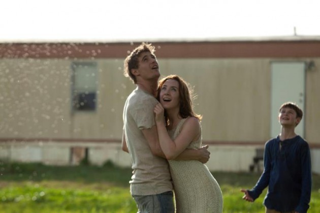 The Seeker asks Wanderer to probe Melanie’s memory to discover where the renegades are. After a moment of resistance she gives up Jamie’s name and Melanie’s inner voice screams at her in defiance. Then she sees this entire montage of Melanie’s past life from happy days with her dog, to swimming with Jamie, to hooking up with Jared(of note she doesn’t mention Jared’s name). The above stills are part of the Jared flashback. They are in front of an RV in the middle of nowhere and Melanie and Jared are swing dancing while Jamie holds the boom box(first photo). In fact the dance sequence is almost identical to the Breaking Dawn wedding where Jackson flips Ashley upside down. It then starts to rain and they all go to rush inside. Jamie goes in first but Jared stops Melanie at the door and he gives her a passionate kiss as she is backed up against the trailer. The second photo is immediately post kiss.
