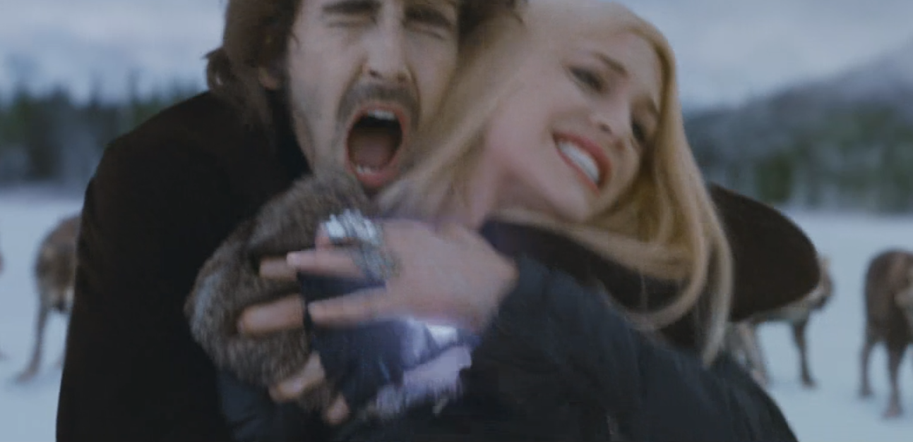 MTV is hosting 15 images from the new trailer. These images include still shots of Renesmee, Aro, Bella and Edward, and that awesome kick from Bella at the end of the trailer. Here are a few more images that they don’t feature for those of you needing more! Jane is first with some new make-up. Garrett and Kate are shown in the final battle. And third is an unknown vampire that I’m going to guess is Henri from the French coven. He is chasing Jacob in wolf form carrying Nessie on his back. If anyone can get a good screen grab of the Romanian coven dropping out of the trees, let me know! I’m not having any luck.