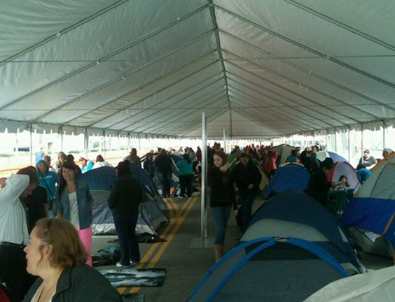 This year they went with a pre-registration system that game people a specific time to show up, confirmation emails, and a check-in table that has more than on person manning it. Also instead of people sleeping in the plaza, they are leaving that free for performance space. Instead, people are bunking in the adjacent streets that have been blocked off.