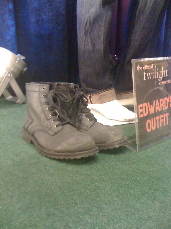 A little over a year ago Laura attended a one of the Official Twilight Conventions run by Creation Entertainment (I think it was San Fransisco but I’m not 100% sure.) They had just put up on display a bunch of costumes that had arrived fresh from the set of Breaking Dawn. At the time, we didn’t know if they were from part 1 or part 2. All we knew was that they were definitely used on set because the clothes (especially the shoes) had dirt all over them. So in other words they weren’t just photo-shoot or standby costumes in case something ripped, they had actually seen use and wear and tear. Well based on what Kristen Stewart and Robert Pattinson are wearing in the EW photo that is teasing tomorrow’s cover shot, they are the same clothes! Here they are up close, and you can clearly see the dirt on Rob’s shoes in the photos: