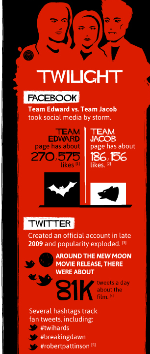 Mashable did a comparison of various vampire themed shows and their social media reach. Twilight came out on top.
