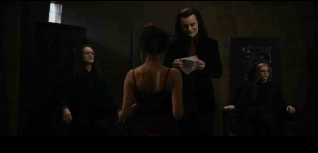 The first 20 seconds or so with the girl in the red dress (Olga Fonda?) in front of the Volturi is an entire scene that never makes it into the movie. Later on in the teaser we see Charlie Bewley throwing the same girl at a wall (see screen cap below roughly the 1:22 mark) To clarify because there is obvious a lot of confusion in our comments and on Twitter: 100% certain that there are 2 Volturi scenes one of which was cut: Girl in the teaser is a brunette with her hair up in a red dress who Charlie Bewley then chucks at a wall. In the actual movie it’s a blonde with her hair down in a black dress that Charlie Bewley and Dan Cudmore just drag off.
