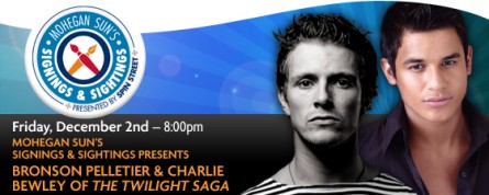It’s the dawning of a new day as Mohegan Sun’s Signings & Sightings presents two break-out stars of the most sought-after vampire movie series. Join Bronson Pelletier & Charlie Bewley of The Twilight Saga on Friday, December 2nd at 8:00pm for a free signing event in The Shops at Mohegan Sun. Then, have a howling good time as they make a special appearance at the Diva Fridays dance party on the Patio of Todd English’s Tuscany.