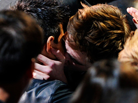 No, not Best Kiss winners Robert Pattinson and Kristen Stewart, who prefer keeping their relationship on the DL. But while R.Pattz and K.Stew enjoying being coy about their rumored romance — teasing MTV Movie Awards audiences with an onstage kiss, yet never quite doing the deed — Rob had no problem locking lips with someone who would “appreciate it a little more”: his other “Twilight” costar, Taylor Lautner. Did we just witness the start of a new movement? Team Edward + Jacob?